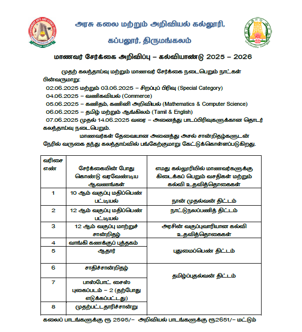 Government Arts and Science College, Thirumangalam Counselling Schedule 2025