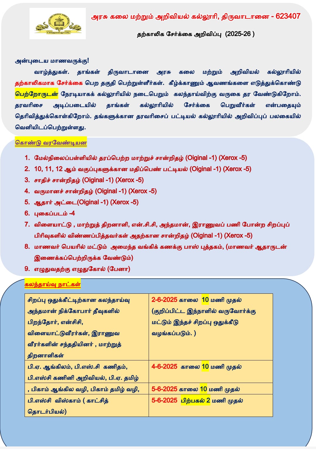Government Arts and Science College, Thiruvadanai Counselling Schedule 2025