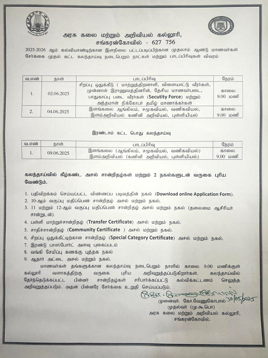 Govt Arts and Science College, Sankarankovil Counselling Schedule 2025