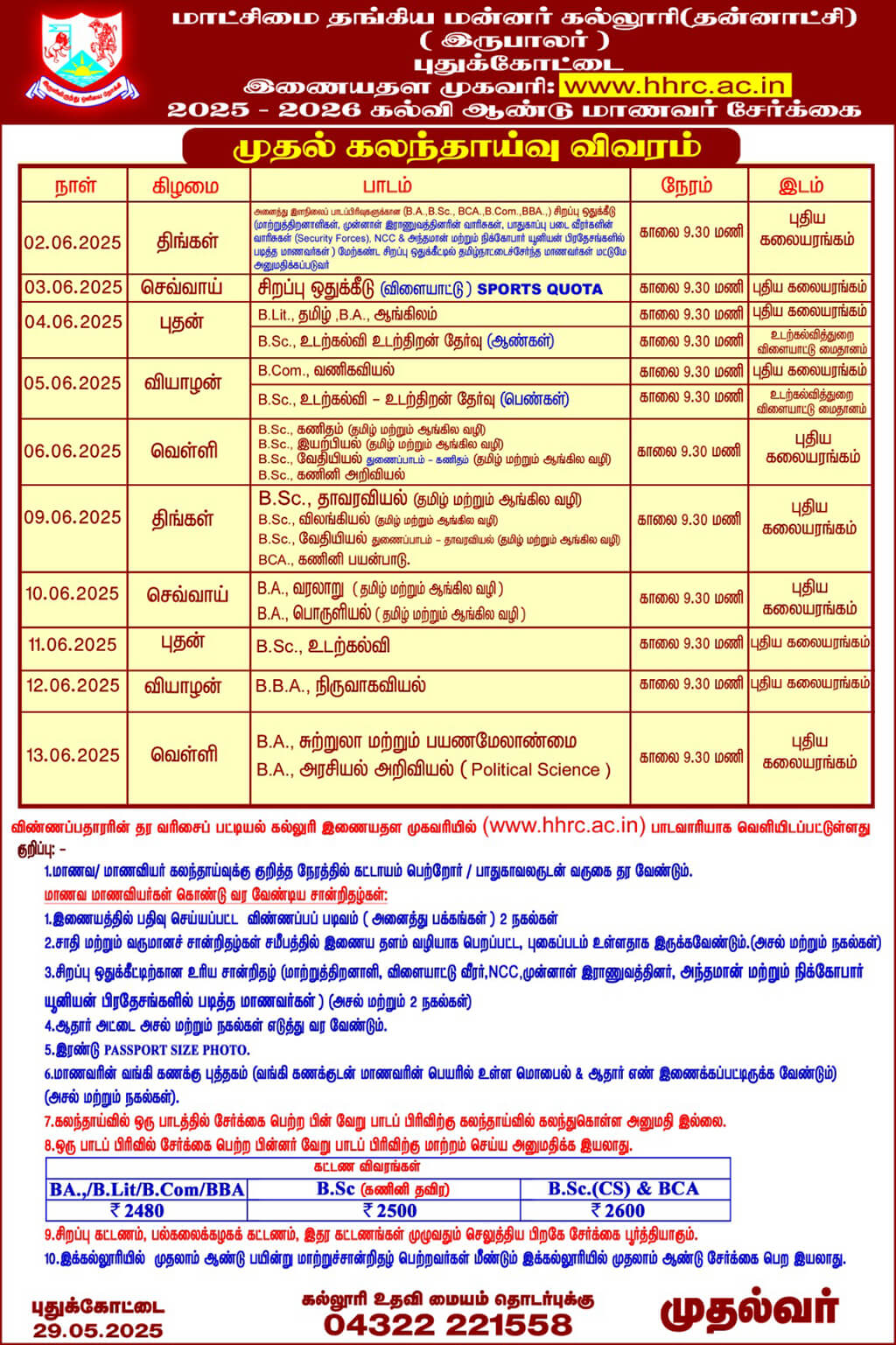 H.H. The Rajah’s College, Pudukkottai Counselling Schedule 2025