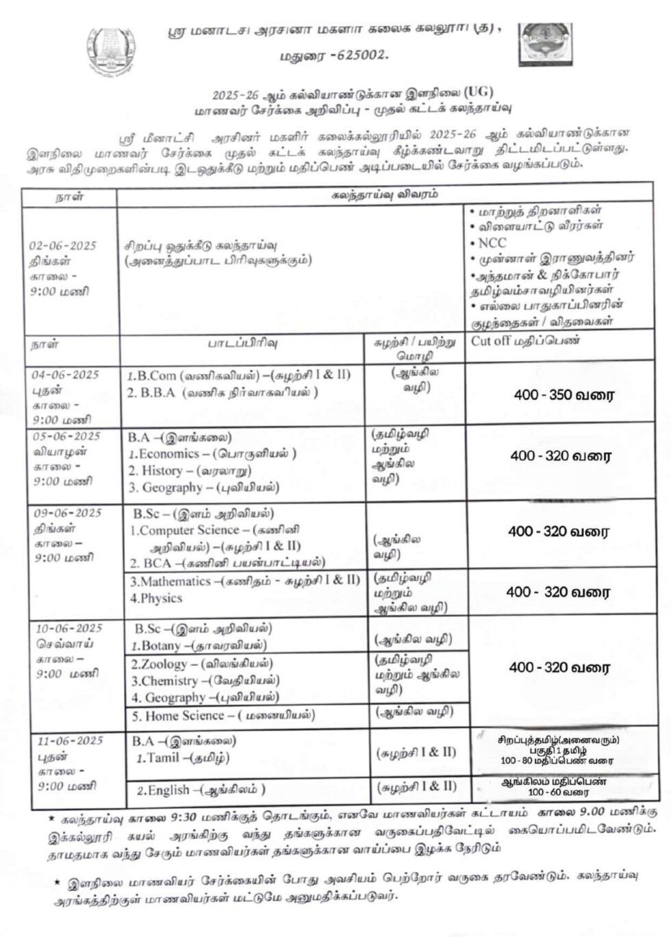 Sri Meenakshi Government Arts College for Women, Madurai Counselling Schedule 2025